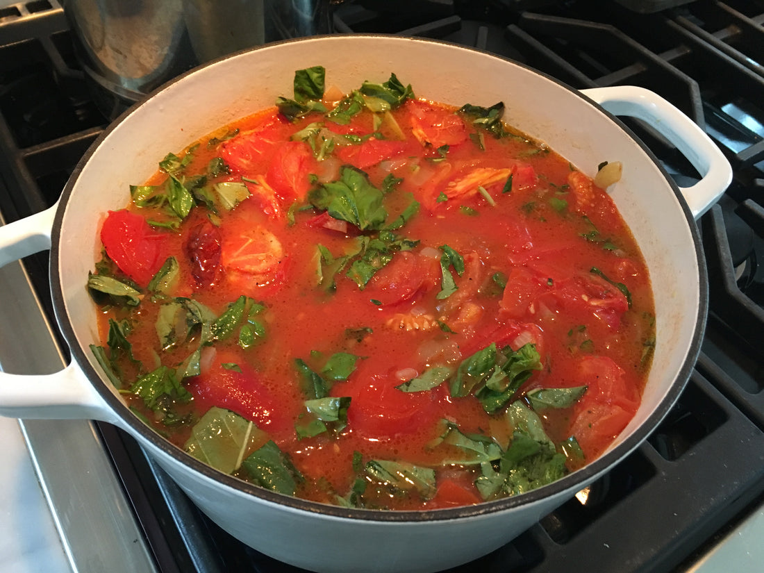 In an 8-quart stockpot over medium heat, sauté the onions and garlic with 2 tablespoons of olive oil, the butter, and red pepper flakes for 10 minutes, until the onions start to brown. Add the canned tomatoes, basil, thyme, and chicken stock. Add the oven-roasted tomatoes, including the liquid on the baking sheet.