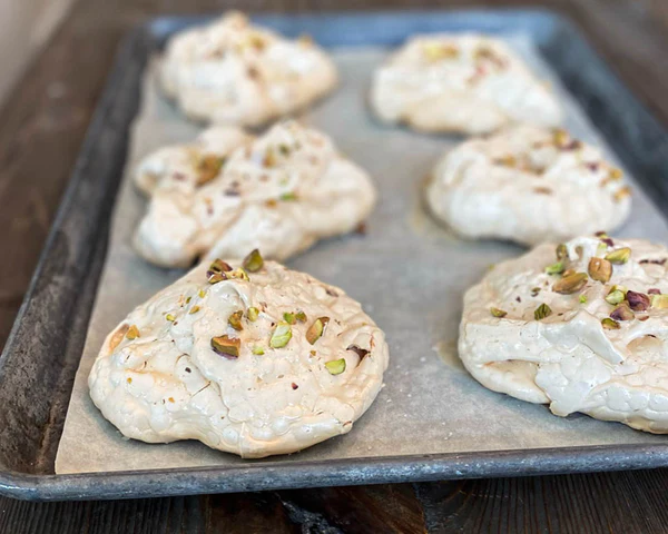 We whipped it a bit longer, scooped it onto half sheet pans, sprinkled the pistachios on top, and baked for a little over 1.5 hours.