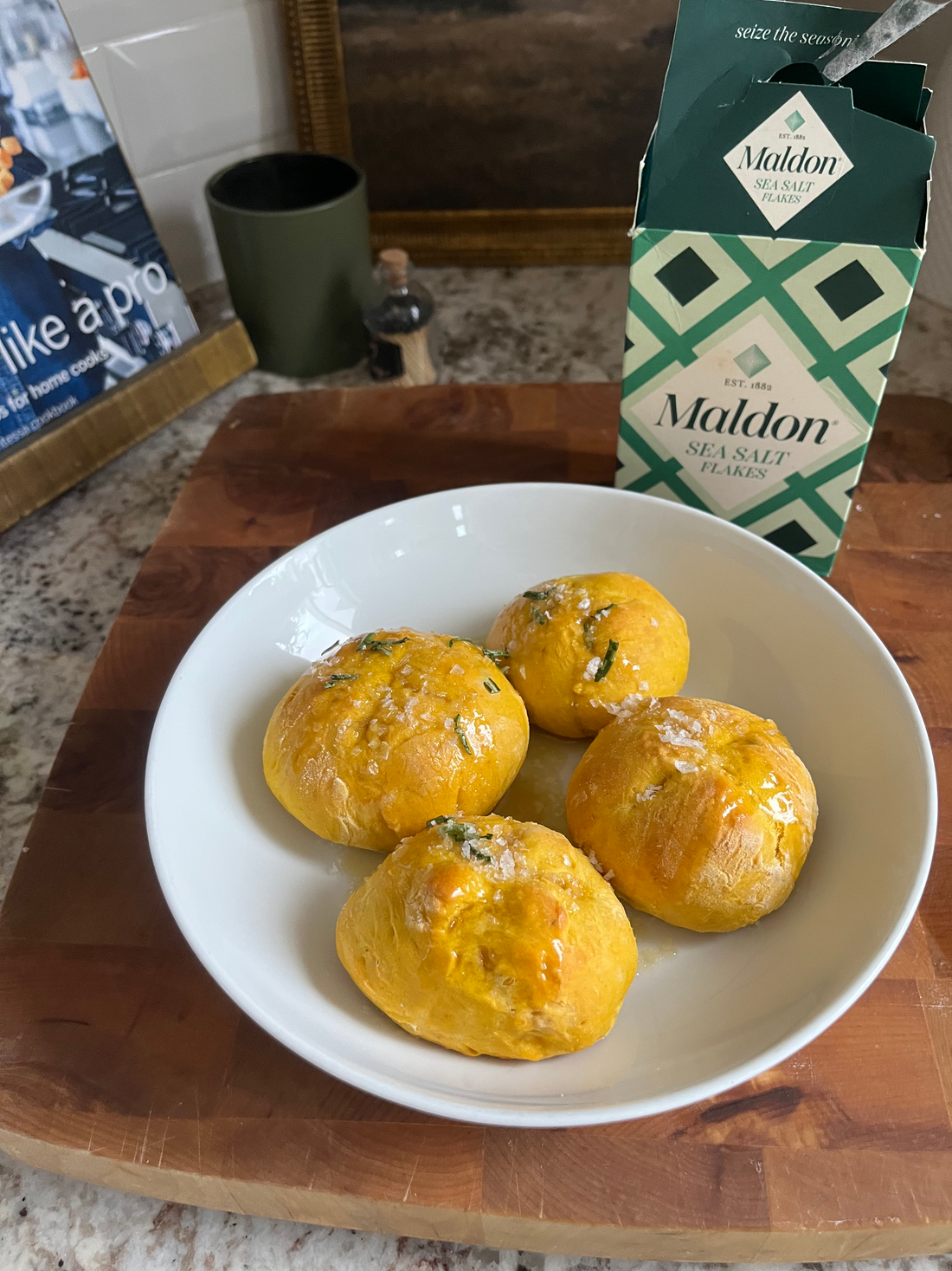 Mix the butter, honey and additional finely chopped rosemary together and brush this liberally over the hot rolls as they come out of the oven. Sprinkle with Maldon Sea Salt and enjoy.