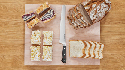 Ideal for cutting clean slices through as many different ingredients as possible: for large fruits and vegetables, meat or a smooth cut through cakes, pies and breads, the outwardly-curved, serrated edge of the WÜSTHOF Super Slicer blade allows for very fine cuts and prevents the foodstuffs from tearing or crumbling.