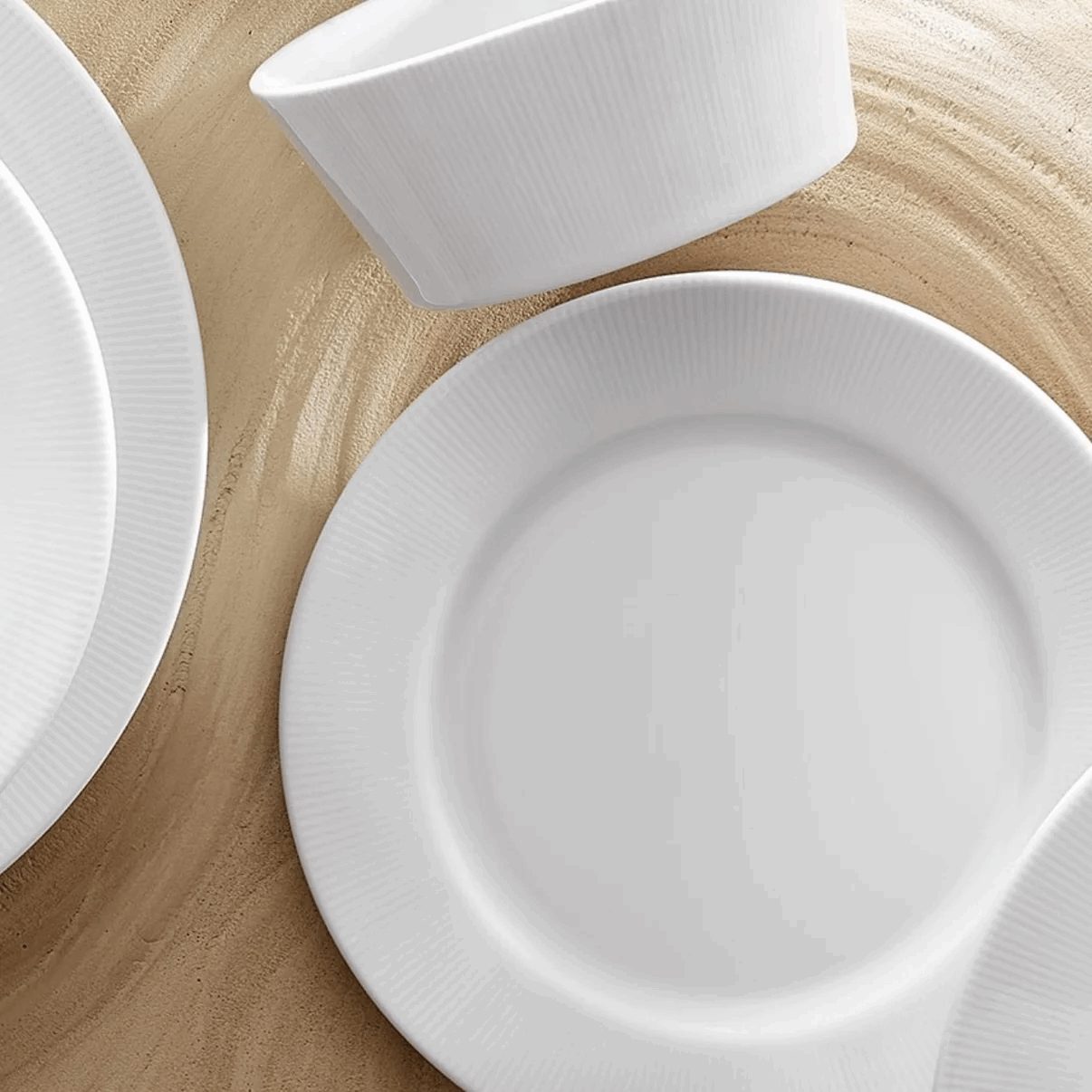 Inspired by the world of Haute Couture, this meticulously crafted collection is embossed with a soft pinstripe design and offers a comprehensive assortment of dinnerware tailored to meet all your needs.