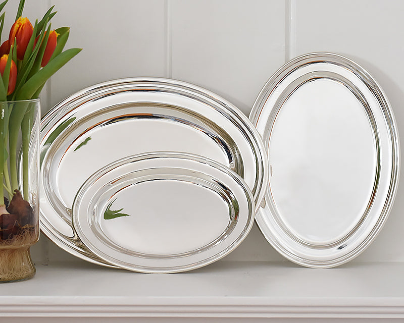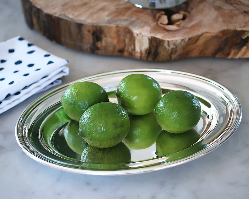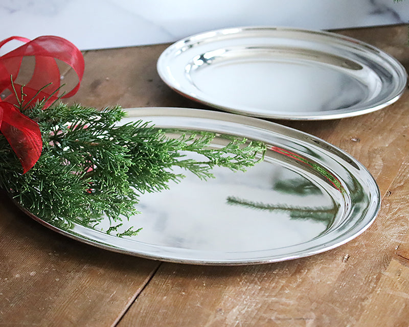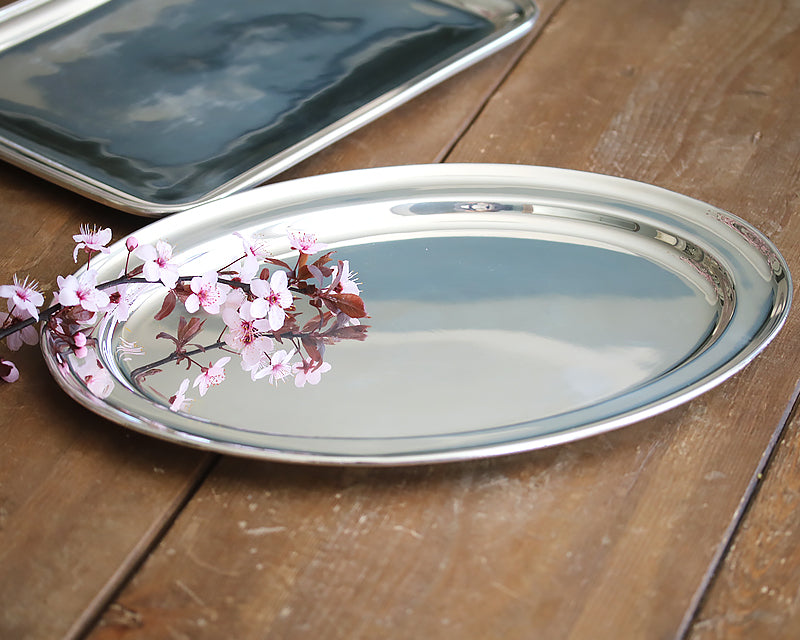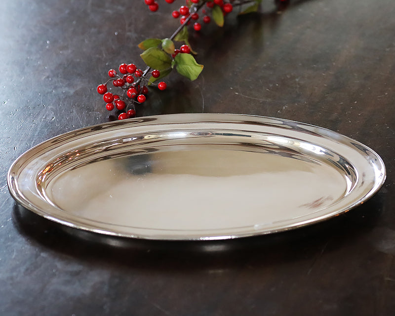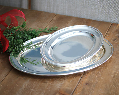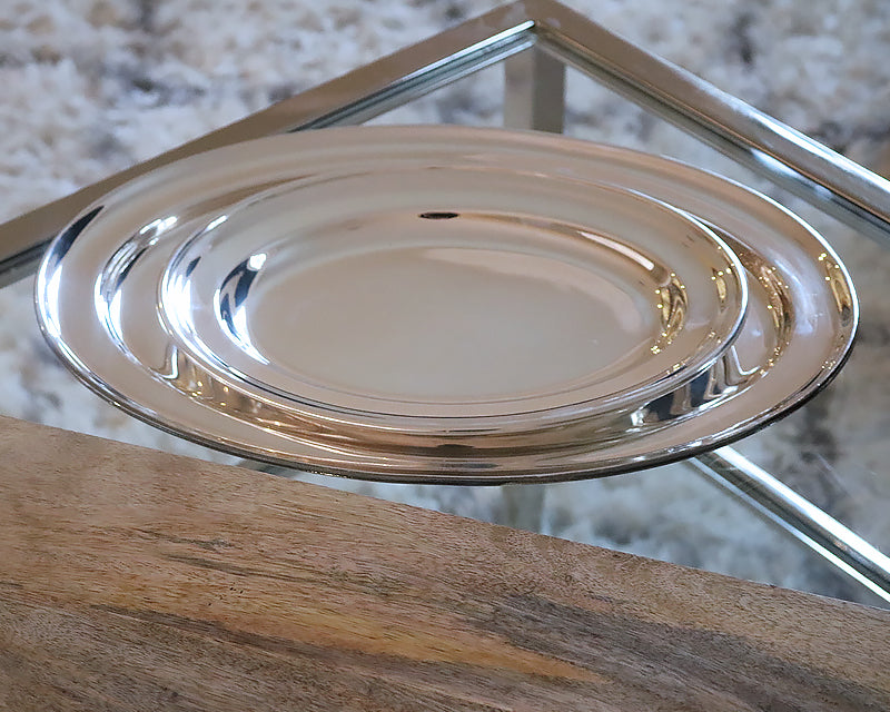 This vintage HÔTEL Silver Oval Tray is a staple in Ina Garten's kitchen. Serving hor d'oeuvres or drinks. It looks spectacular standing up in a glass cabinet or an open shelf in the kitchen and allows it to be visible and accessible. Like the other pieces in the collection, the HÔTEL Silver Oval Tray is functional and designed for everyday use. It's a hefty piece with a thick rolled lip and its streamlined design makes it a must-have. A vintage piece originally made for deluxe European hotels, steamship lines, and fine restaurants, each HÔTEL Silver Oval Tray is triple-plated in pure silver. Available in 18", 16", 14", 12" and 10" lengths.