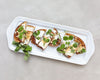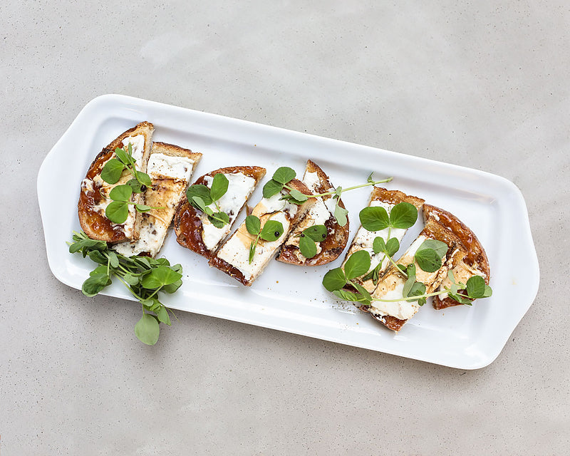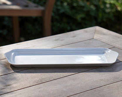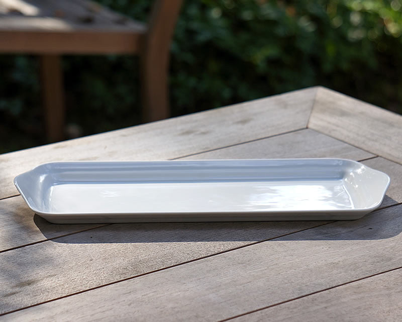 The Narrow Platter by Pillivuyt is great for serving side dishes like roasted asparagus or desserts such as sliced pumpkin and banana bread. We use them a lot for cheeses and dried fruits as well as for serving cookies. Like the other pieces in this collection, they have a simple design that is practical, elegant and attractive enough to go with any fine china on your table. They are microwave, oven, broiler, and dishwasher safe. Each piece can go directly from the freezer to the oven.
