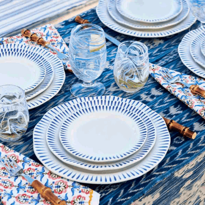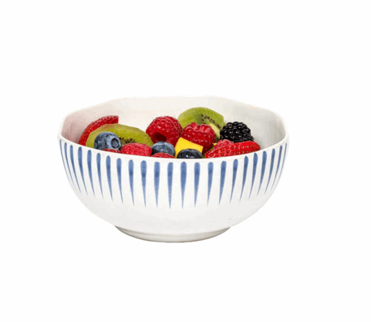 This versatile bowl features a pristine white interior complemented by a sculptural rim adorned with radiant stripes in classic Delft blue. The artful design elevates everyday moments, making each serving - from morning cereals to evening desserts - feel like a special occasion. Its generous proportions and timeless aesthetic create the perfect vessel for both casual meals and elegant entertaining.